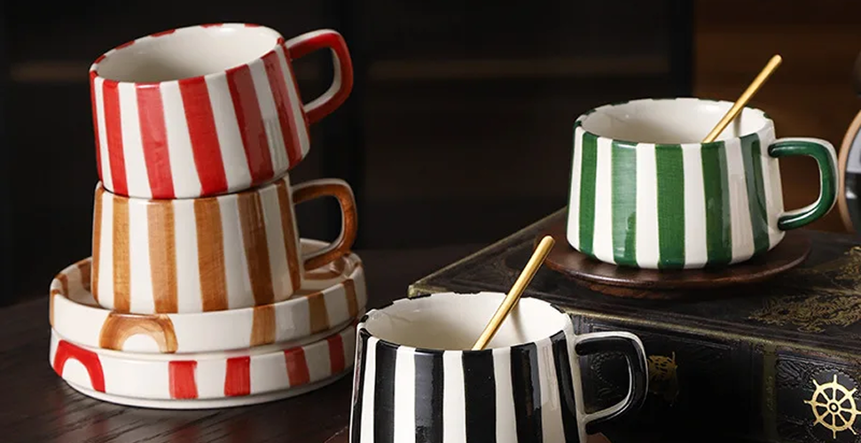 1SET Simple Hand-painted Striped Ceramic Mug Creative Multi-color Gift Cup Home Practical Coffee Cup Saucer
